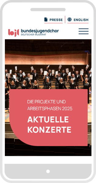 Die Webseite lehnt sich an das Corporate Design des DMR an, hat aber eine eigene Interpretation erhalten. Mit einer Reihe individuell für den BJC gestalteten Elemente werden Interessierte z.B. über Auftrittstermine und alles andere zum Ensemble informiert, potentielle neue Sänger und Sängerinnen zudem umfassend über den Bewerbungsprozess.