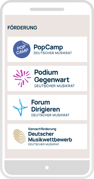 Die Projekte des DMR (z.B. Bundeswettbewerb Jugend Musiziert, Deutscher Musikwettbewerb, Forum Dirigieren, Bundesjazzorchester uvm.) werden in einem kompakten Slider als Elemente mit Logo, Bild und Kurzbeschreibung nach Zufallsprinzip ausgegeben. Alle Projekte können durch Sliden angesehen werden.