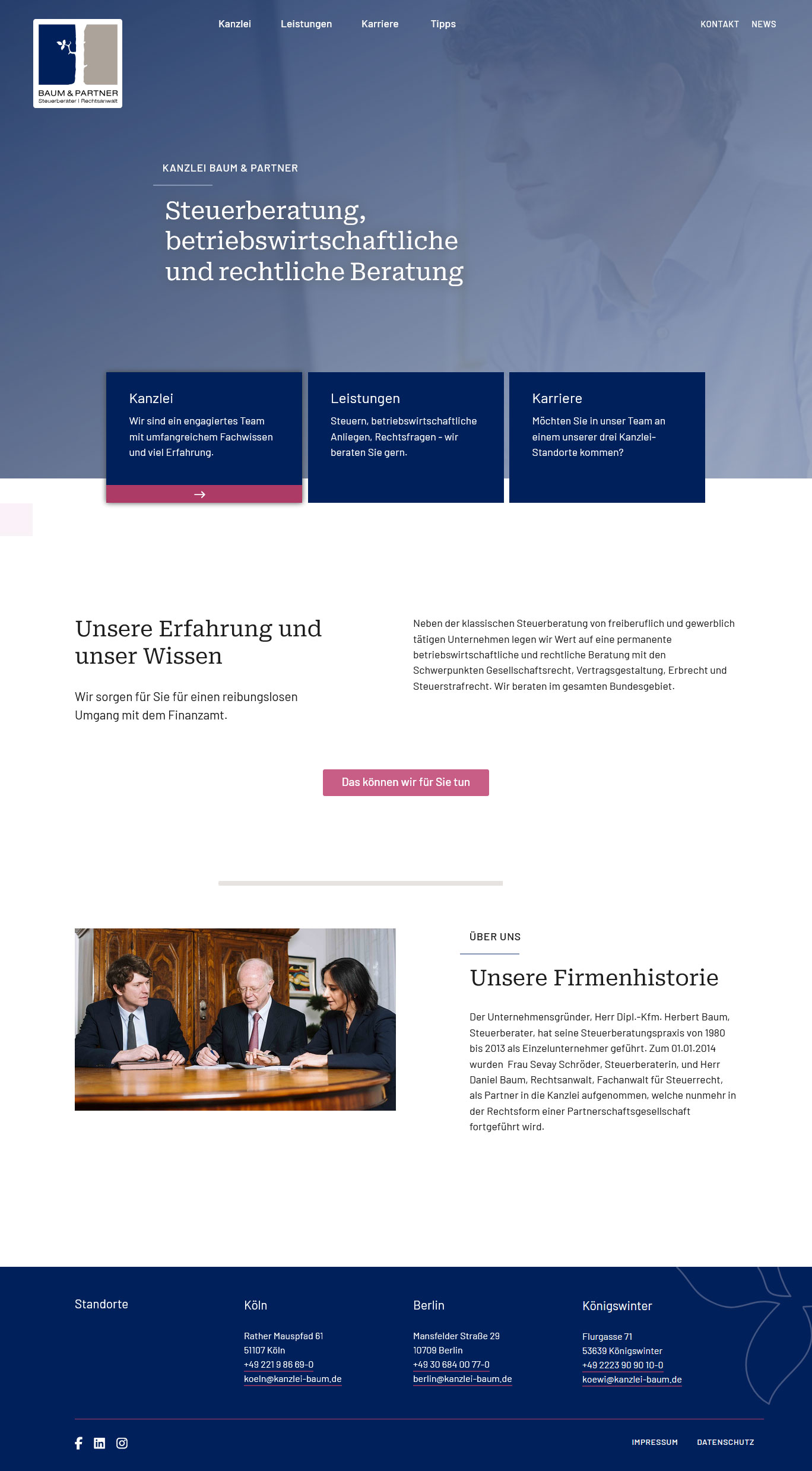 Baum & Partner ist eine inhabergeführte Kanzlei mit den Schwerpunkten Steuerberatung, betriebswirtschaftliche und rechtliche Beratung. Deutschlandweit gehören drei Standorte zu Baum & Partner. fixpunkt betreut die Webseite der Kanzlei seit 2025.