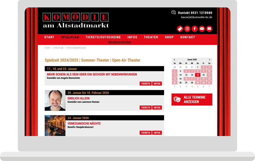 Theater-Webseite mit Spielplan, Kalender, Preistabellen und vielen Infos für das interessierte Publikum